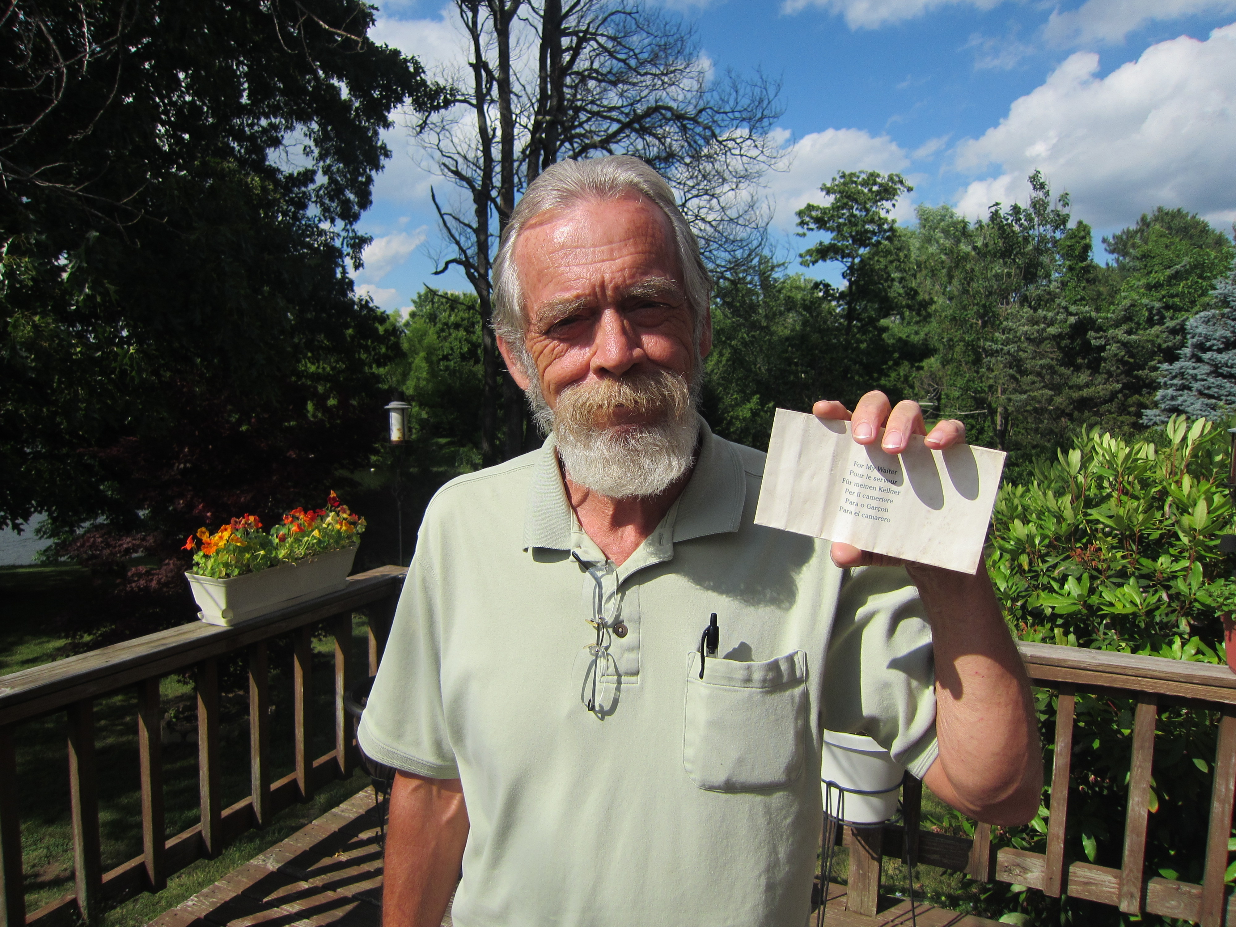 That’s the real deal, friends and neighbors. At first he thought it was some kind of love letter written on an envelope, which said “For my Walter” but, it’s hard to read messages through wavy glass. Once he got it out, we realized that it says “For my waiter” in six different languages.